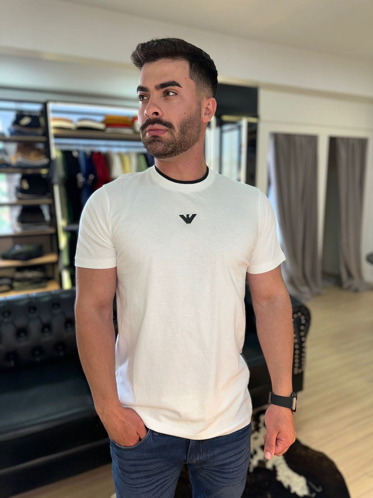 Camiseta Armani Exchange branca, confeccionada em algodão de alta qualidade, garantindo toque macio e caimento impecável. Possui modelagem slim, gola careca com detalhe em ribana preta contrastante e logo da marca em relevo no peito, trazendo um visual moderno e sofisticado.