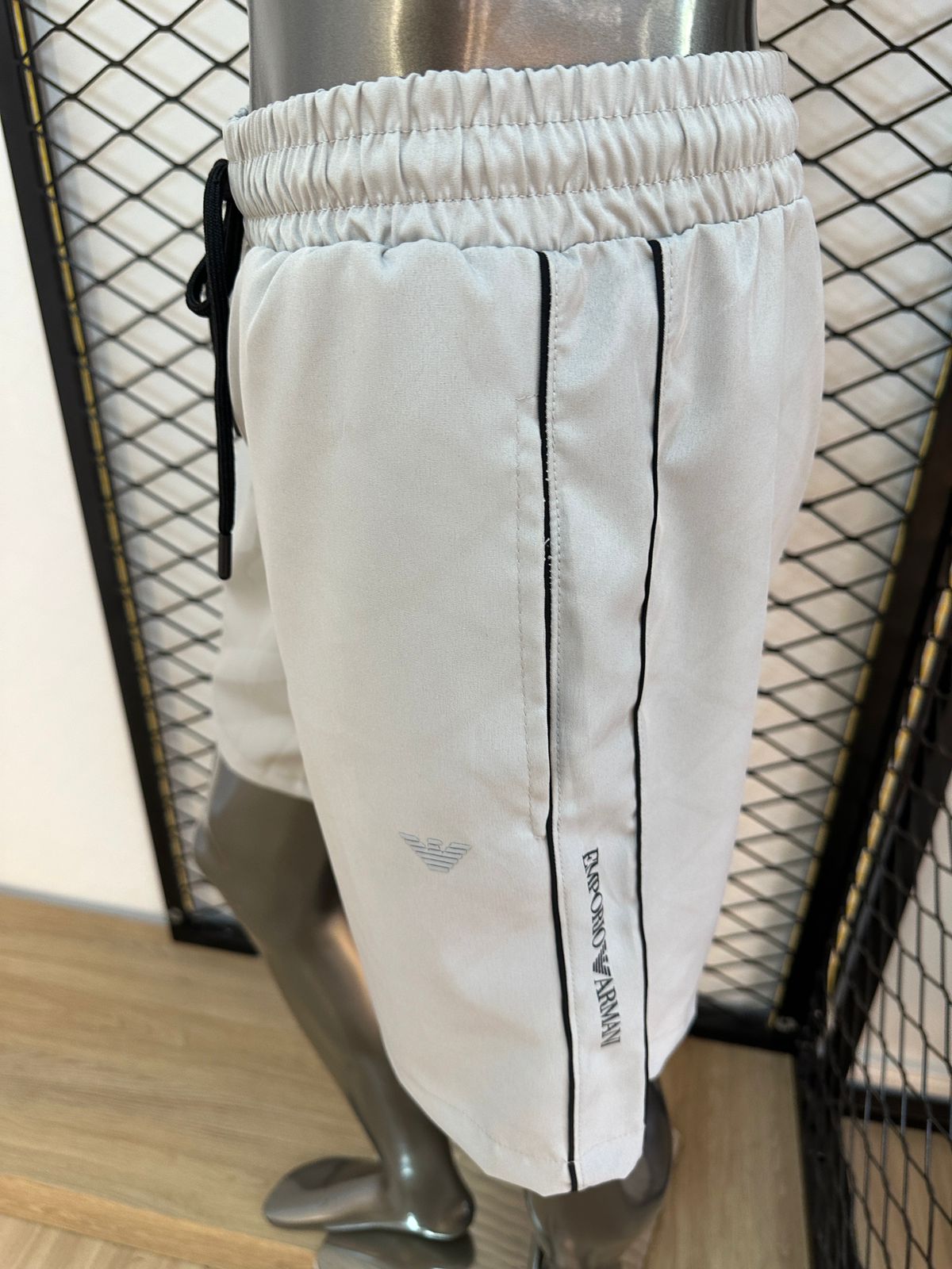 Apresenta cós elástico com cordão ajustável, bolsos laterais funcionais e detalhe lateral com o logo Emporio Armani em destaque, além do ícone da águia discreto na parte frontal — um toque de exclusividade e elegância.