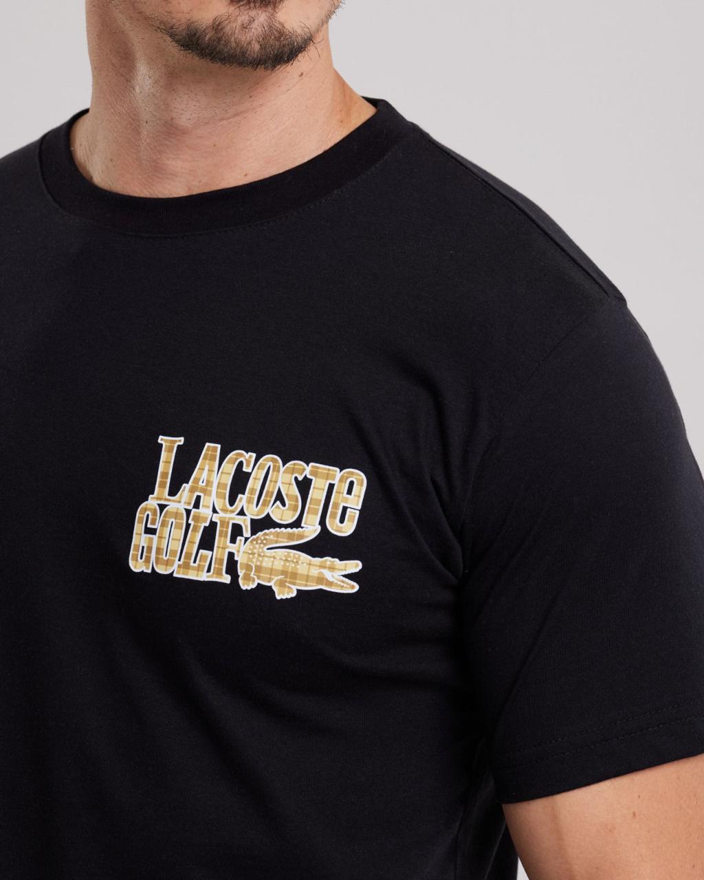Apresenta estampa exclusiva “Lacoste Golf” em tom dourado com textura xadrez, tanto na parte frontal quanto nas costas, reforçando o estilo esportivo sofisticado característico da marca.