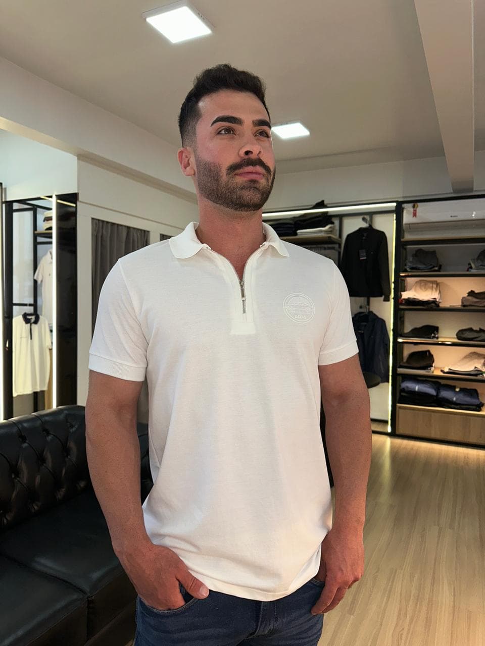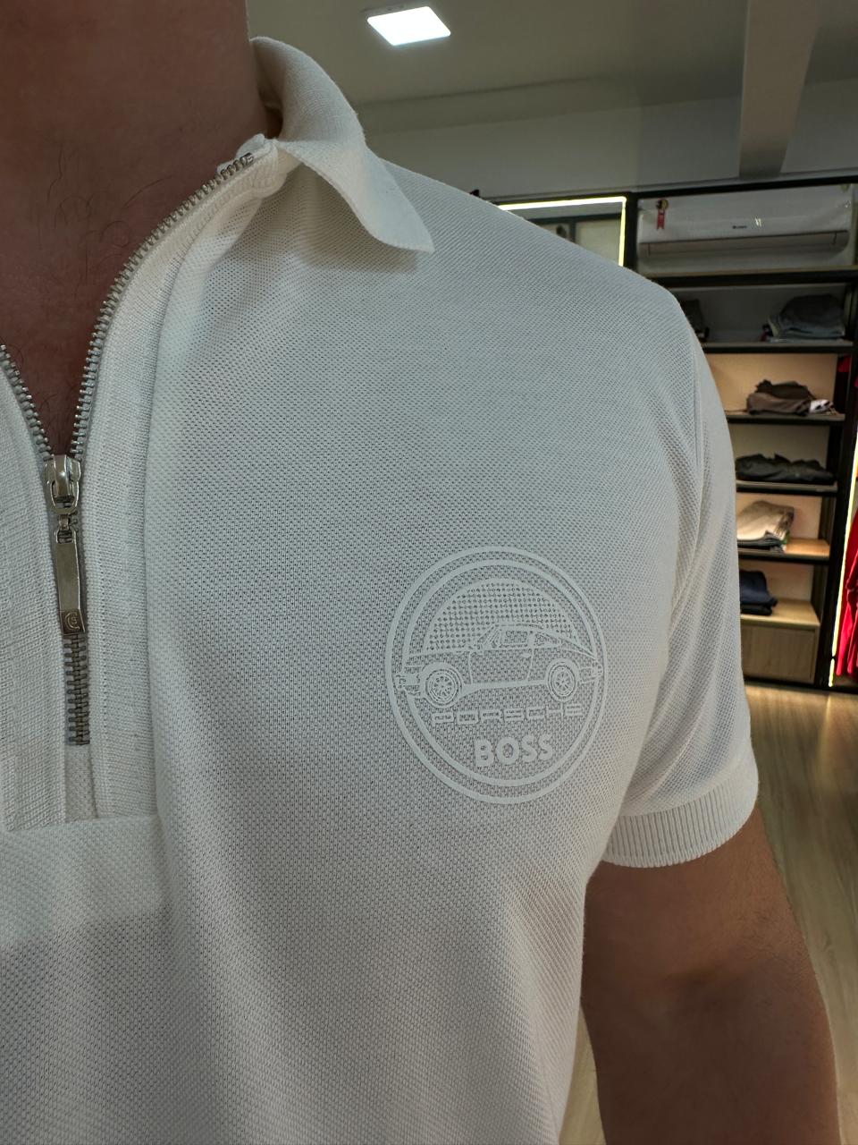Polo Porsche x Boss, desenvolvida em malha de algodão premium com toque suave e excelente caimento. O modelo apresenta gola esportiva com zíper metálico, que adiciona modernidade e estilo à clássica polo.