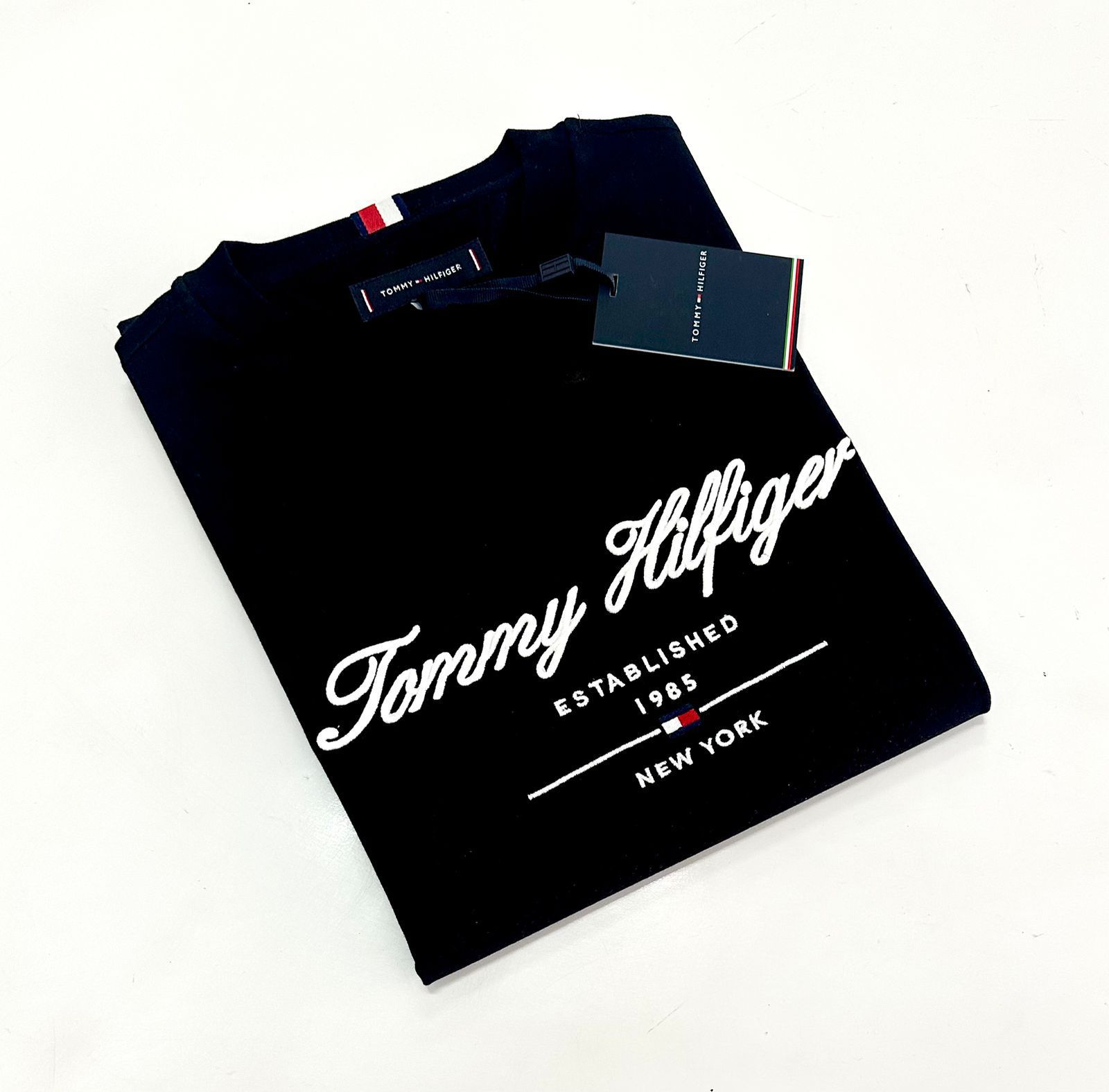 O modelo conta com o icônico logo “Tommy Hilfiger” bordado em estilo caligrafia na parte frontal, além dos tradicionais detalhes da marca: bandeirinha bordada na manga e a faixa tricolor aplicada na parte interna da gola, reforçando a autenticidade da peça.